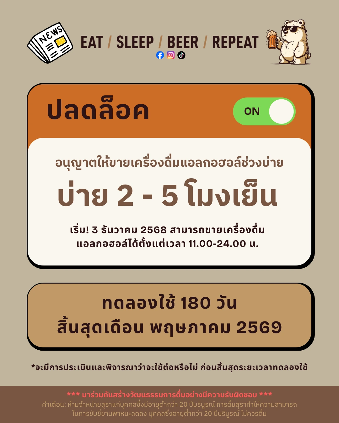 อนุญาตให้ขายเครื่องดื่มแอลกอฮอล์ บ่าย 2 - 5 โมงเย็น เริ่ม! 3 ธันวาคม 2568
